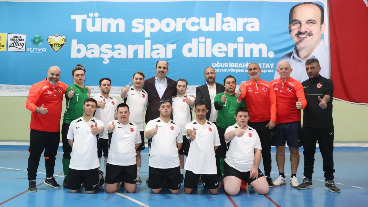 Konya Büyükşehir Belediye Başkanı Uğur İbrahim Altay, Down Sendromlular Futsal Milli Takımı’nın hazırlık yaptığı Selçuk Üniversitesi 75. Yıl Spor Salonu’ndaki antrenmanını ziyaret ederek özel sporcularla bir araya geldi.