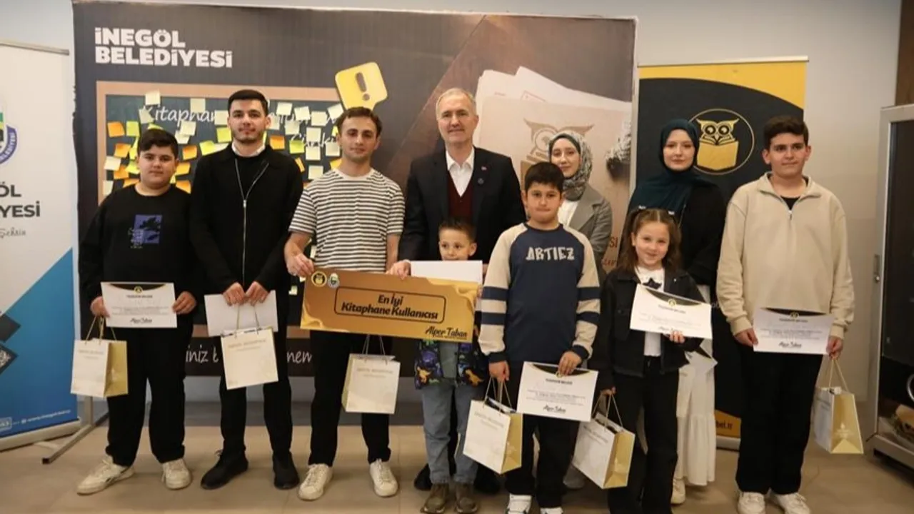 Bursa'da İnegöl Belediyesi, Kütüphaneler Haftası etkinlikleri kapsamında 5 Nöbetçi Kitaphanenin En’lerini belirledi. “En Çok Kitap Okuyan” ve “En İyi Kullanıcı” seçilen gençler, ödüllerini Belediye Başkanı Alper Taban’dan aldı. Başkan Taban, ödül töreninde yeni kitaphanelerin de müjdelerini verdi.BURSA (İGFA) - İnegöl Belediyesi’nin örnek projelerinden olan ve 30 bin aktif üye ile günlük 800 ila bin öğrencinin kullandığı Nöbetçi Kitaphanelerde Kütüphaneler Haftası etkinlikleri kapsamında artık geleneksel hale gelen Kitaphane En’lerinin Ödüllendirilmesi programı gerçekleştirildi.
