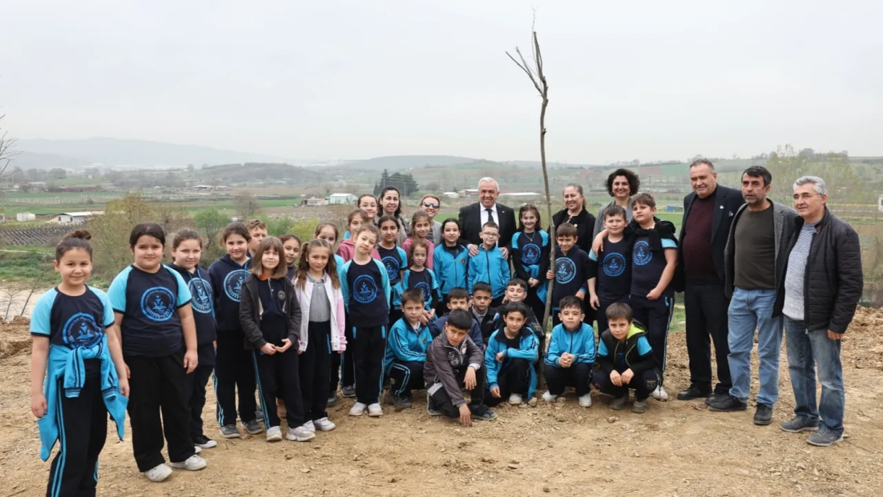 Nilüfer Belediye Başkanı Şadi Özdemir de alanda gruplar halinde ayrılan çocuklarla birlikte, çınar fidanlarını toprakla buluşturdu.