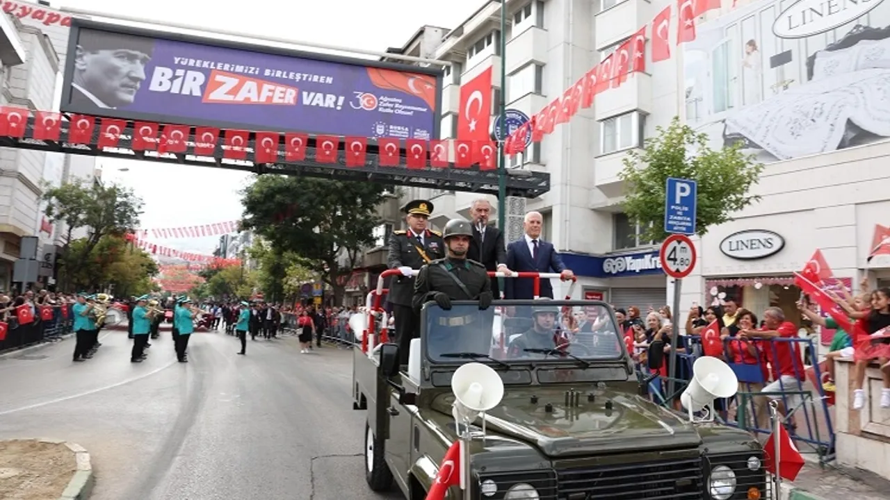 Başkomutan Gazi Mustafa Kemal Atatürk’ün liderliğinde kahraman ordumuz ve milletimizin inancıyla kazanılan 30 Ağustos Zafer Bayramı’nın 103’üncü yıldönümü, tüm yurtta olduğu gibi Bursa’da da büyük bir coşkuyla kutlanıyor. Bursa Büyükşehir Belediye Başkanı Mustafa Bozbey, tüm Bursalıları akşam yapılacak yürüyüşe ve konsere davet etti.BURSA (İGFA) - 30 Ağustos Zafer Bayramı coşkusu, Bursa’da vatandaşların yoğun ilgisi eşliğinde Valilik, Büyükşehir Belediyesi ve Garnizon Komutanlığı çelenklerinin Atatürk Anıtı’na bırakılmasıyla başladı. Saygı duruşu, İstiklal Marşı’nın okunması ve Türk Bayrağı’nın göndere çekilmesinin ardından Vali Ayyıldız, Başkan Bozbey ve protokol üyeleri, Tarihi Valilik Binası’na geçerek tebrikleri kabul etti. Daha sonra üstü açık araca binen Vali Erol Ayyıldız ve Başkan Mustafa Bozbey, törene katılan vatandaşları selamlayıp, bayramlarını kutladı.