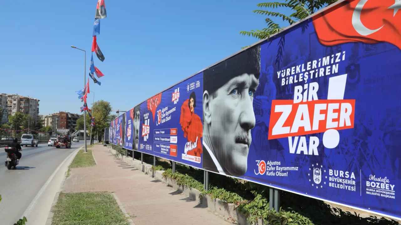 Bursa Büyükşehir Belediyesi, 30 Ağuston Zafer Bayramı öncesinde kentin dört bir tarafını ‘Bir Zafer Var’ temalı afiş ve billboardlarla donatarak 7’den 70’e herkese Büyük Zafer’in coşkusunu yaşatıyor.BURSA (İGFA) - Bursa Büyükşehir Belediyesi, tüm milli bayramlarda olduğu gibi 30 Ağustos Zafer Bayramı’nın 103. yıl dönümünü de zengin içerikli programlarla kutluyor.