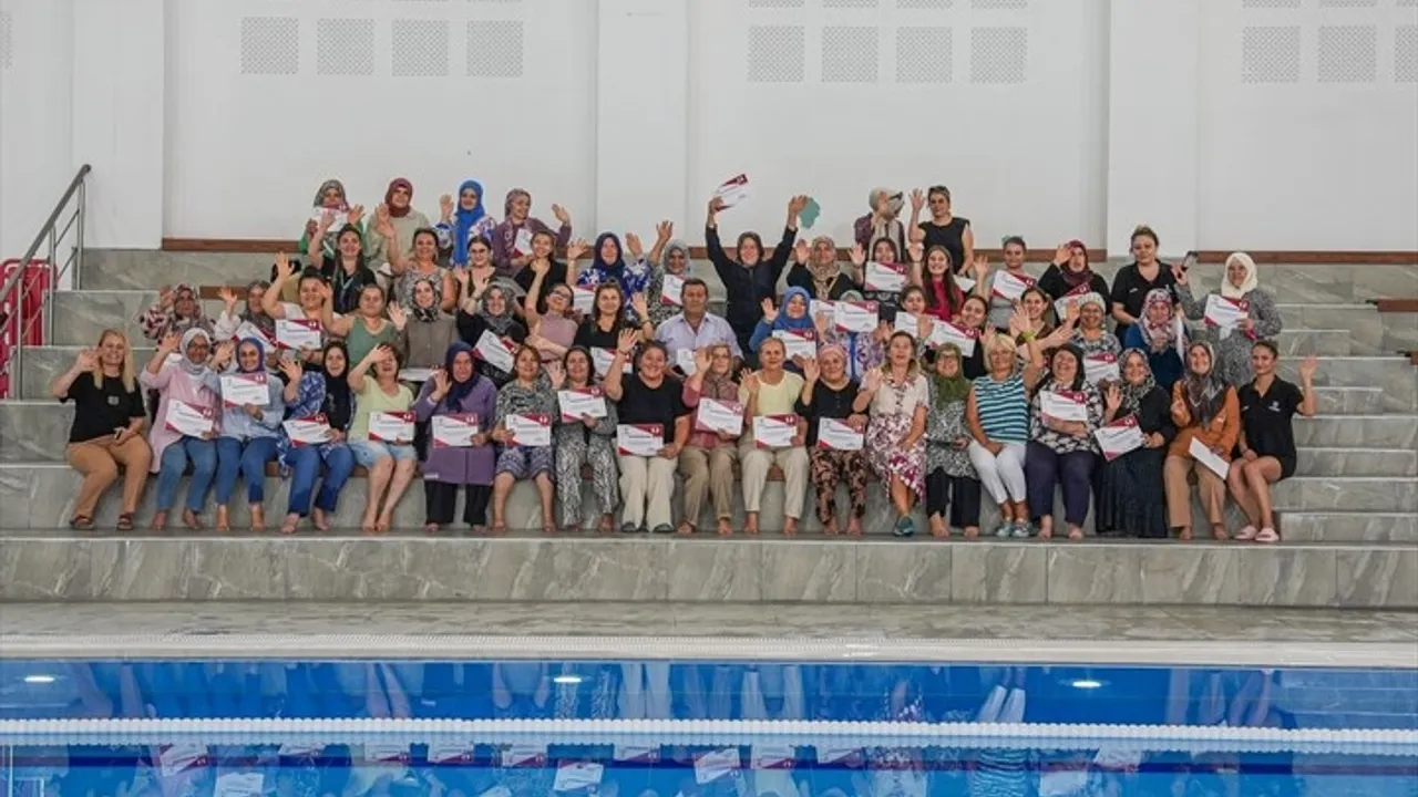 Denizli Büyükşehir Belediyesi tarafından kadınlara yönelik olarak hayata geçirilen “Yüzme Bilmeyen Kalmasın” projesi tüm hızıyla sürüyor. Proje kapsamında, Anafartalar-Dokuzkavaklar Kapalı Yüzme Havuzu’nda Pınarkent, Küçükdere, Yeniköy ve Irlıganlı mahallelerinde ikamet eden yaklaşık 80 kadın kursiyer, haftanın iki günü aldıkları eğitimlerle temel yüzme becerilerini kazandı.DENİZLİ (İGFA) - Eğitimlerin sonunda düzenlenen törenle katılımcılara başarı sertifikaları verildi. Programa, Denizli Büyükşehir Belediye Başkanı Bülent Nuri Çavuşoğlu’nun eşi Nilgün Çavuşoğlu da katıldı. Kadınlarla bir araya gelen Nilgün Çavuşoğlu, hem tebrik etti, hem de yaşadıkları bu özel süreci dinleyerek onların mutluluğuna ortak oldu. Törene Gençlik ve Spor Hizmetleri Dairesi Başkanı Ayşe Sarıkaya da eşlik etti.