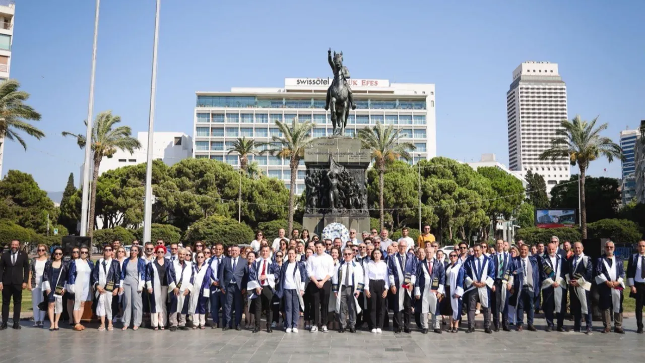Dokuz Eylül Üniversitesi (DEÜ), 43. kuruluş yıl dönümünü büyük bir coşku ve gururla kutladı.İZMİR (İGFA) - DEÜ Rektörü Prof. Dr. Bayram Yılmaz’ın yanı sıra DEÜ’nün üst yönetimi ve akademik/idari kadrosunun katılımıyla gerçekleşen kutlama töreninde DEÜ Rektörlük Yerleşkesinden Cumhuriyet Meydanı’na yapılan yürüyüş sonrasında Atatürk Anıtı’na çelenk sunuldu.
