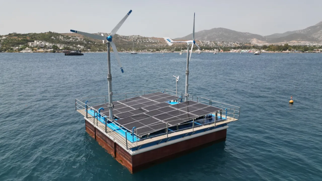 Muğla'da Bodrum Belediyesi, kuraklığa çözüm olarak deniz suyunu içme ve kullanma suyuna dönüştüren, güneş ve rüzgâr enerjisiyle çalışan yüzer arıtma sistemi kurdu. Sişstem, Türkiye’de ve dünyada ilk kez uygulandı.MUĞLA (İGFA) - Bodrum Belediyesi İklim Değişikliği ve Sıfır Atık Müdürlüğü tarafından, Blue Hybrid Solutions iş birliği ile hayata geçirilen “Yenilikçi Yüzer Deniz Suyu Arıtma Platformu” tanıtıldı.