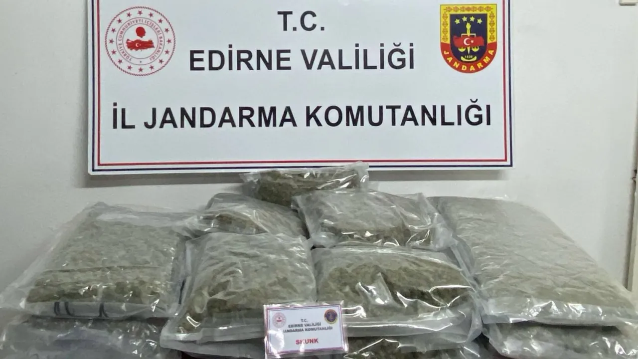 Edirne İl Jandarma Komutanlığı'na bağlı ekipler, uyuşturucu madde arama köpeği ve insansız hava aracı (İHA) desteğiyle düzenledikleri takipli operasyonda, 16,5 kilogram skunk maddesi ele geçirdi. Uyuşturucu maddeye el konulurken, olayla ilgili soruşturmanın sürdüğü belirtildi.