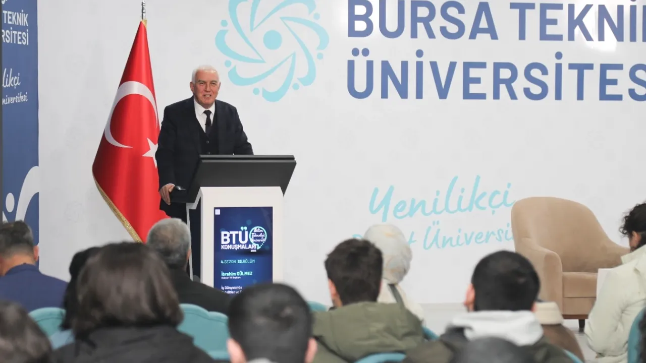 BTÜ Konuşmaları’nın konuğu Haksan Otomotiv Yönetim Kurulu Başkanı İbrahim Gülmez, Türkiye’nin sanayi açısından fırsatlarının öğrenciler tarafından iyi değerlendirilmesi gerektiğini ifade ederek, ‘başarı için hedefinizi belirleyerek, rekabet edecek yönlerinizi zenginleştirin’ dedi.BURSA (İGFA) - Bursa Teknik Üniversitesi öğrencileri, BTÜ Konuşmaları programıyla alanında uzman isimlerle buluşmaya devam ediyor. Bu doğrultuda her çarşamba günü Mimar Sinan Yerleşkesi Turkuaz Salon’da gerçekleşen BTÜ Konuşmaları’nın 4’ncü sezon 33’ncü bölüm konuğu, Haksan Otomotiv Yönetim Kurulu Başkanı İbrahim Gülmez oldu.
