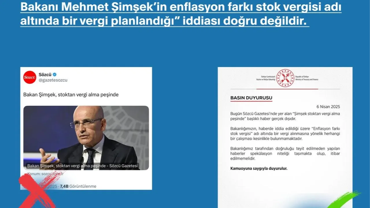 Dezenformasyonla Mücadele Merkezi'nden yapılan yazılı açıklamada, Hazine ve Maliye Bakanlığınca iddiaya konu “Enflasyon farkı stok vergisi” adı altında vergi alınmasına yönelik herhangi bir çalışma bulunmadığının altı çizildi.