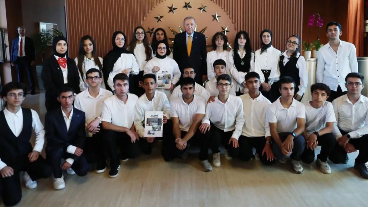 Millî Eğitim Bakanı Yusuf Tekin'in de bulunduğu kabulde, Cumhurbaşkanı Erdoğan öğrencilerle sohbet etti ve hatıra fotoğrafı çektirdi.