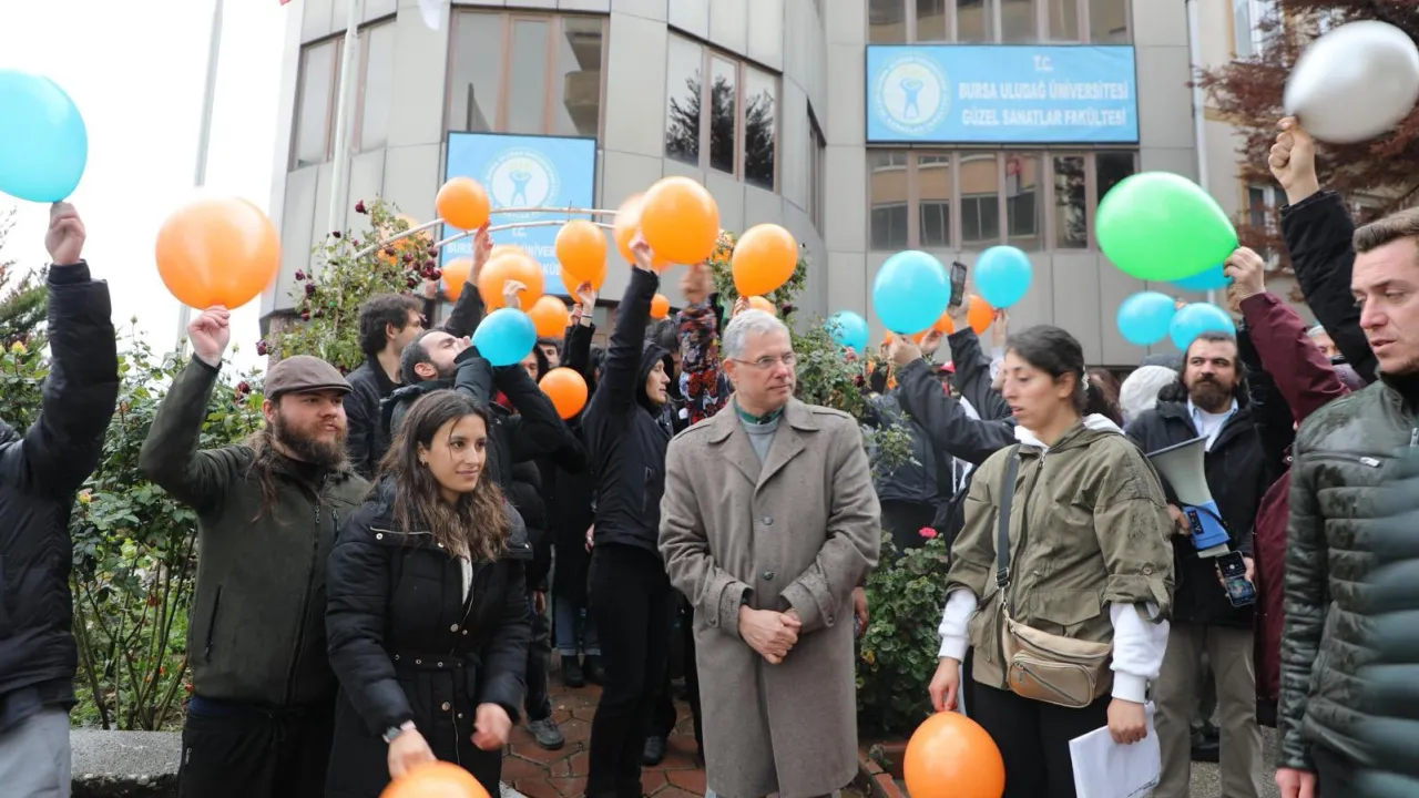 Bursa Uludağ Üniversitesi GSF Tiyatro Bölümü öğrencilerinin, sıra arkadaşları Vuslat Su Yiğit ile beraber anayasal protesto hakkını kullandıkları için tutuklanan tüm gençler adına düzenledikleri dayanışma etkinliğinde, tutuklu öğrencilerin özgürlüğünü simgeleyen balonlar kullanıldı.