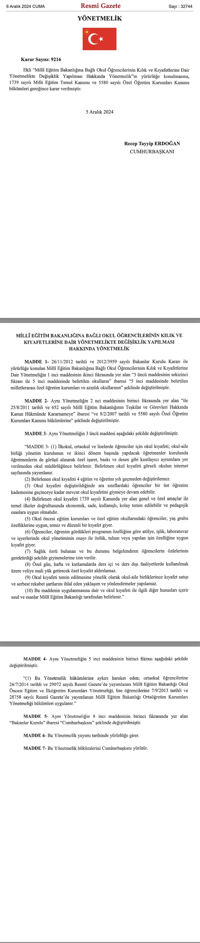 Cumhurbaşkanı ve AK Parti Genel Başkanı Recep Tayyip Erdoğan imzasıyla Resmi Gazete'de yayımlanan MEB kararnamesine göre, bağlı okul öğrencilerinin kılık ve kıyafetlerine dair değişiklik yapılması hakkındaki yeni yönetmelik yürürlüğe girdi.