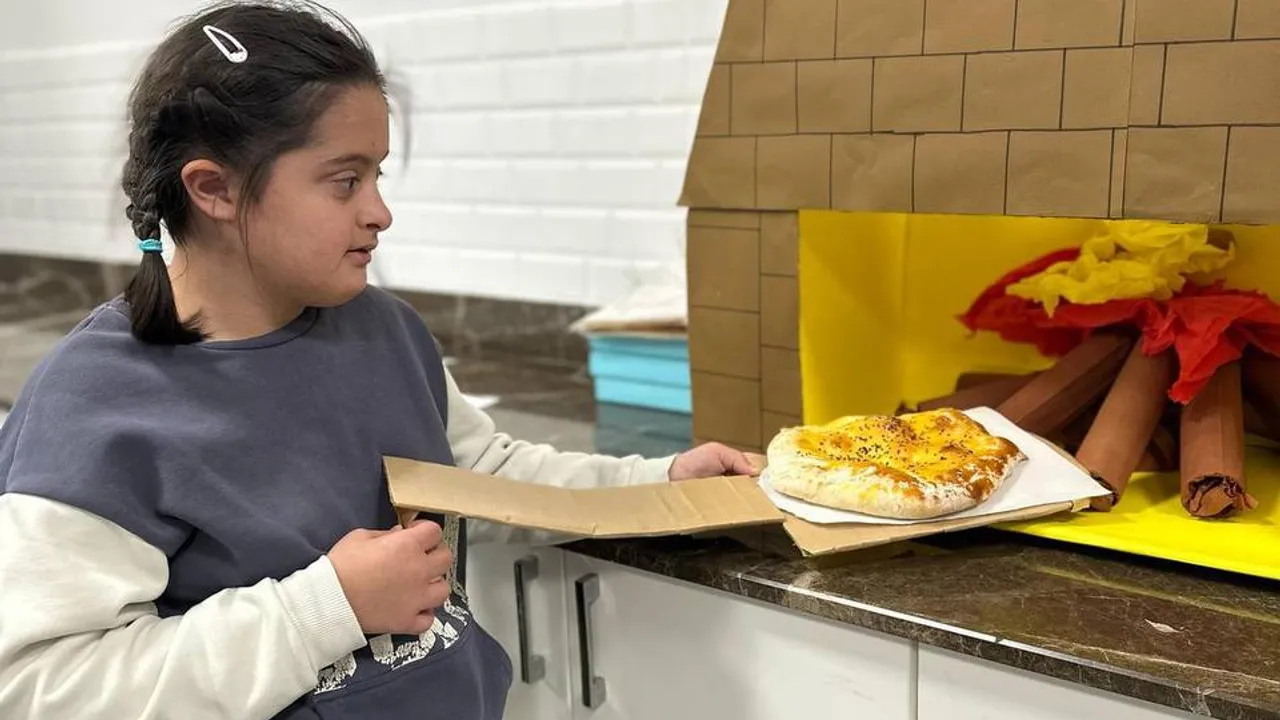 Karasu Yaren Özel Eğitim ve Rehabilitasyon Merkezi iş birliğiyle gerçekleştirilen programda down sendromlu çocuklar, mutfak atölyesinde Ramazan pidesi yaptı.